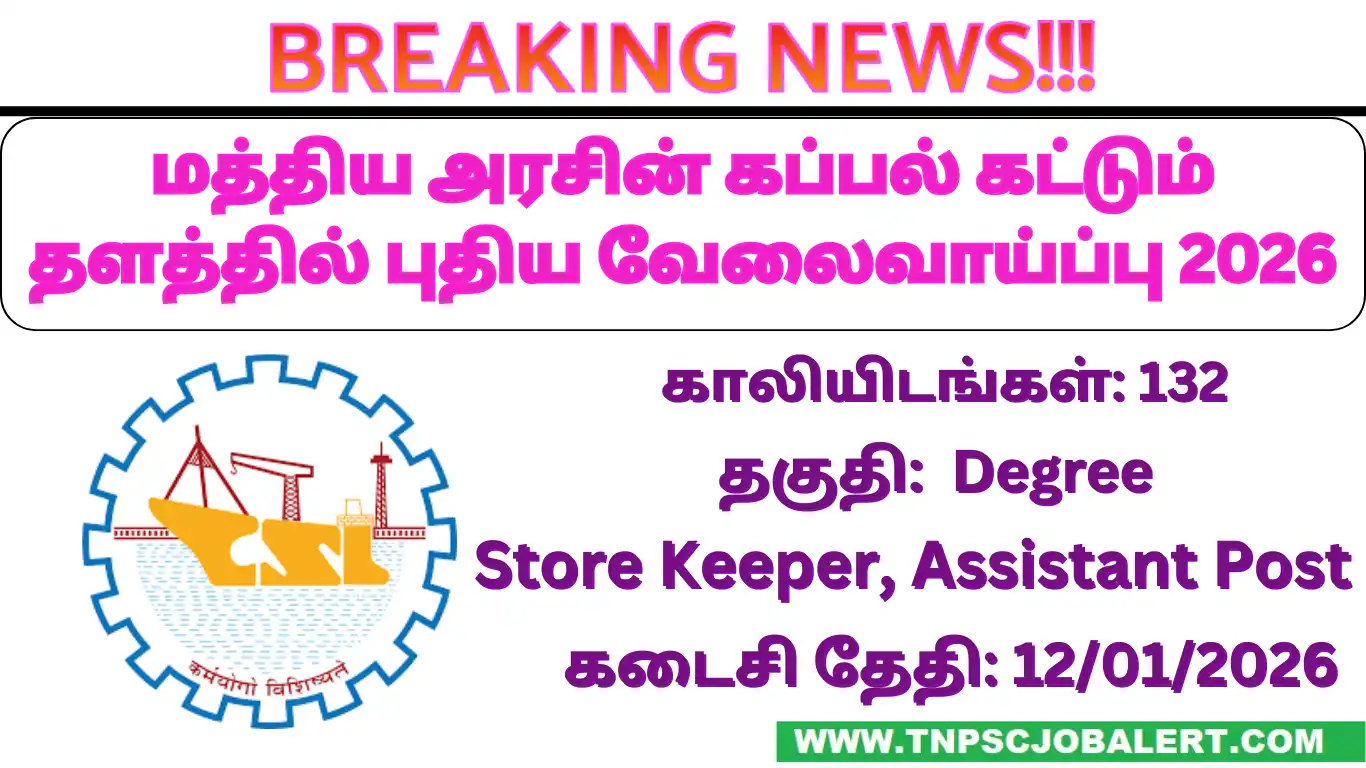 CSL Job Recruitment 2026 releases the official notification from the starting date of 26/12/2025 and the closing date of 12/01/2026 . For the applying CSL Job Recruitment 2026 – 132, Store Keeper, Assistant Post procedure, the candidate needs to fill out their respective application either online or offline as per the notification released by CSL . Below we have explained briefly explained about the CSL Job Recruitment 2026 – 132, Store Keeper, Assistant Post like education details, age limits, how to apply, closing date of CSL Job Recruitment 2026 .