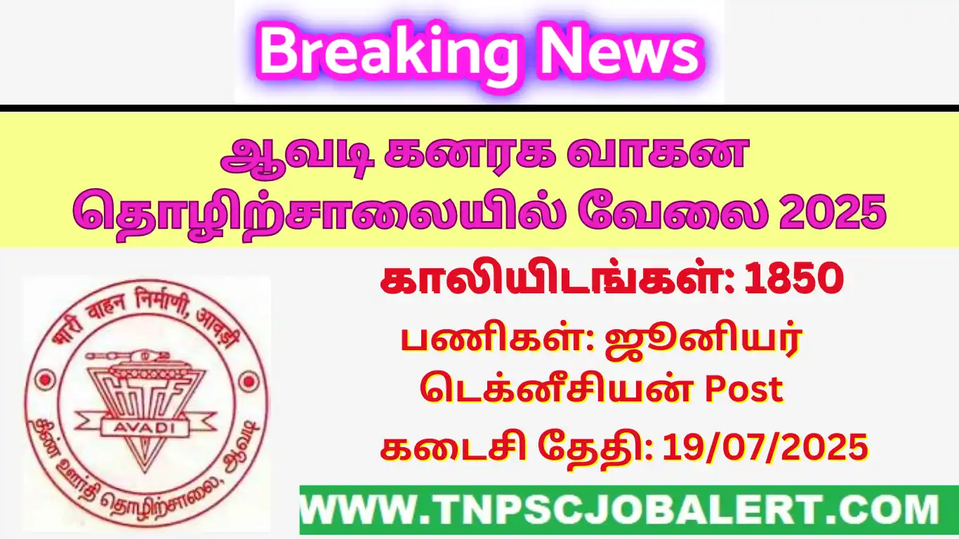 HVF Avadi Job Recruitment 2025 releases the official notification from the starting date of 28/06/2025 and the closing date of 19/07/2025 . For the applying HVF Avadi Job Recruitment 2025 – 1,850, Junior Technician Post procedure, the candidate needs to fill out their respective application either online or offline as per the notification released by HVF Avadi . Below we have explained briefly explained about the  HVF Avadi Job Recruitment 2025 – 1,850, Junior Technician Post like education details, age limits, how to apply, closing date of HVF Avadi Job Recruitment 2025