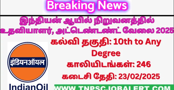 Indian Oil Corporation Job Recruitment 2025 releases the official notification from the starting date of 03/02/2025 and the closing date of 23/02/2025 . For the applying Indian Oil Corporation Job Recruitment 2025 – 246, Junior Attendant / Grade I Post procedure, the candidate needs to fill out their respective application either online or offline as per the notification released by Indian Oil Corporation . Below we have explained briefly explained about the Indian Oil Corporation Job Recruitment 2025 – 246, Junior Attendant / Grade I Post like education details, age limits, how to apply, closing date of Indian Oil Corporation Job Recruitment 2025 .