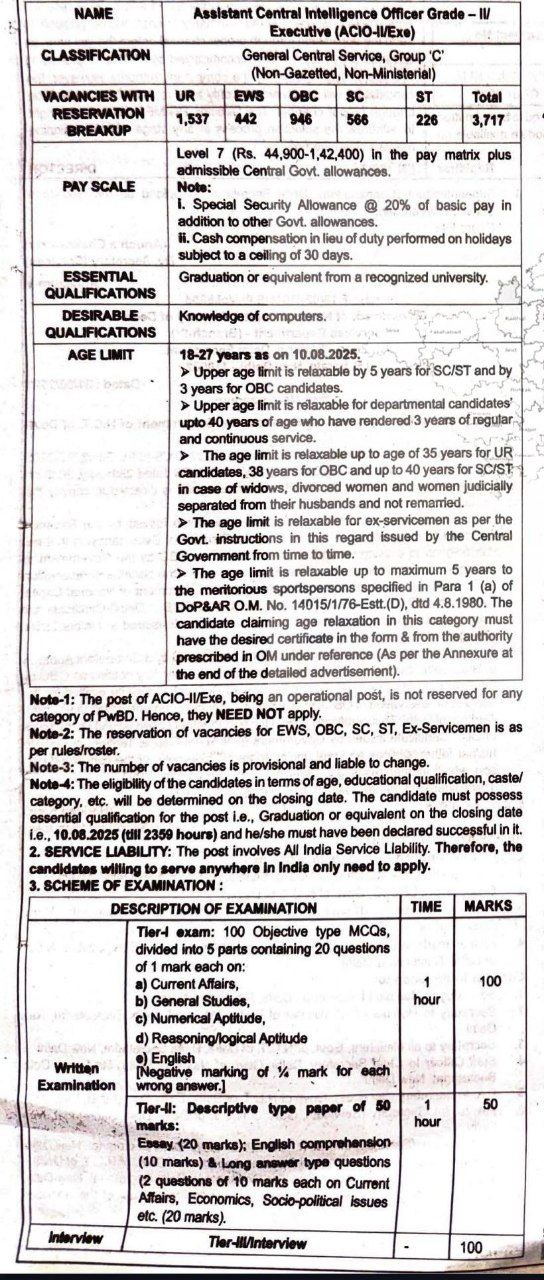 According to the post of Intelligence Bureau Job Recruitment 2025 – 3,717, ACIO-II (Executive) Post recruits 3,717 candidates to select. All candidates have to be requested to check the current job openings of Intelligence Bureau Job Recruitment 2025  before applying to this job recruitment.