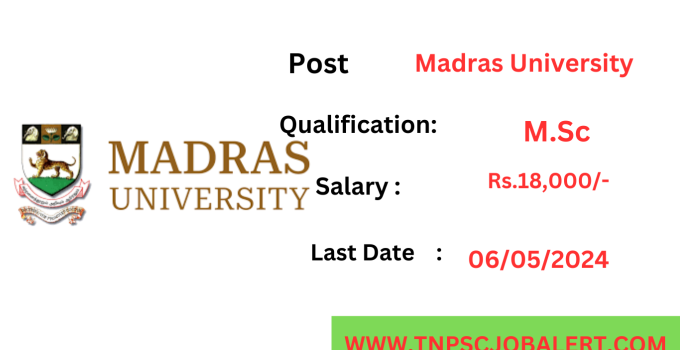 Madras University Job Recruitment 2024 releases the official notification from the starting date of 26/04/2024 and the closing date of 06/05/2024. For the applying Madras University Job Recruitment 2024 – Various , Project Fellow post procedure, the candidate needs to fill out their respective application either online or offline as per the notification released by Madras University. Below we have explained briefly explained about the Madras University Job Recruitment 2024 – Various , Project Fellow post like education details, age limits, how to apply, closing date of Madras University Job Recruitment 2024.