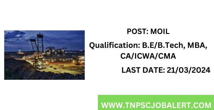 MOIL Job Recruitment 2024 releases the official notification from the starting date of 01/03/2024 and the closing date of 21/03/2024. For the applying MOIL Job Recruitment 2024 – 44 ,Management Trainee (MT) Post procedure, the candidate needs to fill out their respective application either online or offline as per the notification released by Manganese Ore India Limited. Below we have explained briefly explained about the MOIL Job Recruitment 2024 – 44 ,Management Trainee (MT) Post like education details, age limits, how to apply, closing date of MOIL Job Recruitment 2024.