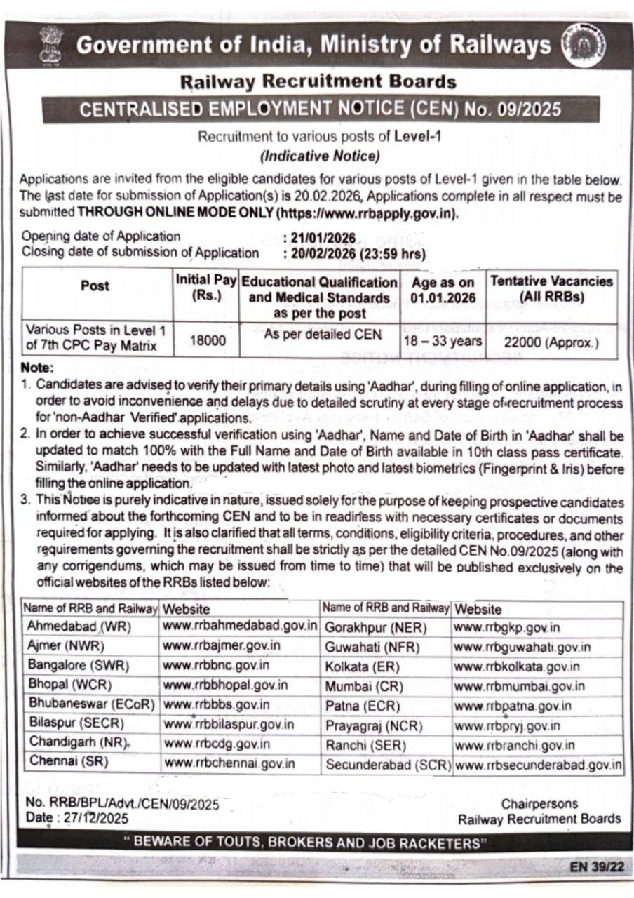 RRB Job Recruitment 2026 releases the official notification from the starting date of 21/01/2026 and the closing date of 20/02/2026 . For the applying RRB Job Recruitment 2026 – 22,000, Group D Post procedure, the candidate needs to fill out their respective application either online or offline as per the notification released by RRB . Below we have explained briefly explained about the RRB Job Recruitment 2026 – 22,000, Group D Post like education details, age limits, how to apply, closing date of RRB Job Recruitment 2026 .