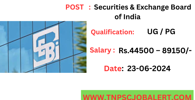 Securities & Exchange Board of India Job Recruitment 2024 releases the official notification from the starting date of 11/06/2024 and the closing date of 30/06/2024. For the applying Securities & Exchange Board of India Job Recruitment 2024 – 62, Assistant Manage post procedure, the candidate needs to fill out their respective application either online or offline as per the notification released by Securities & Exchange Board. Below we have explained briefly explained about the Securities & Exchange Board of India Job Recruitment 2024 – 62, Assistant Manage post like education details, age limits, how to apply, closing date of Securities & Exchange Board of India Job Recruitment 2024.