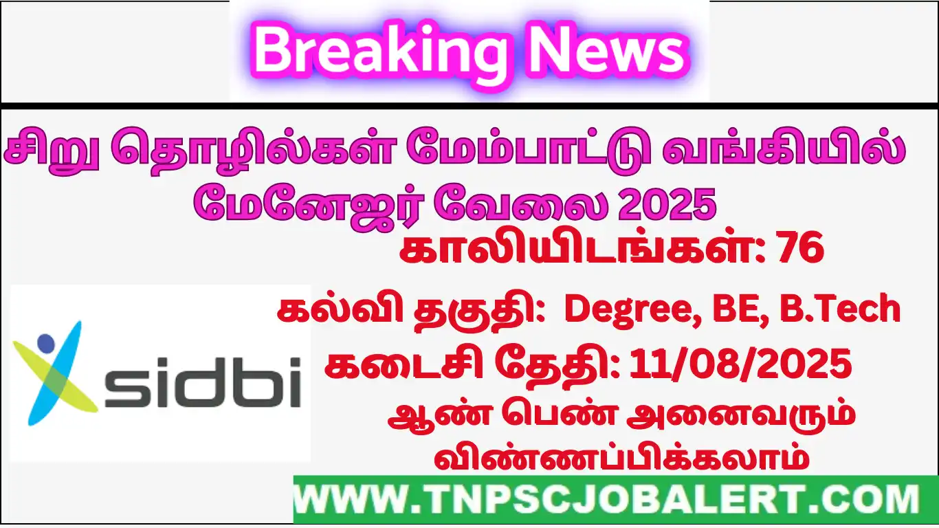 SIDBI Bank Job Recruitment 2025 releases the official notification from the starting date of 14/07/2025 and the closing date of 11/08/2025 . For the applying SIDBI Bank Job Recruitment 2025 – 76, Assistant Manager Post procedure, the candidate needs to fill out their respective application either online or offline as per the notification released by SIDBI . Below we have explained briefly explained about the  SIDBI Bank Job Recruitment 2025 – 76, Assistant Manager Post like education details, age limits, how to apply, closing date of SIDBI Bank Job Recruitment 2025