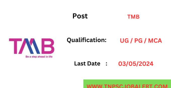 Tamilnadu Mercantile Bank (TMB) Job Recruitment 2024 releases the official notification from the starting date of 22/04/2024 and the closing date of 03/05/2024. For the applying Tamilnadu Mercantile Bank (TMB) Job Recruitment 2024 – Various, Manager post procedure, the candidate needs to fill out their respective application either online or offline as per the notification released by Tamilnadu Mercantile Bank. Below we have explained briefly explained about the Tamilnadu Mercantile Bank (TMB) Job Recruitment 2024 – Various, Manager post like education details, age limits, how to apply, closing date of Tamilnadu Mercantile Bank (TMB) Job Recruitment 2024.