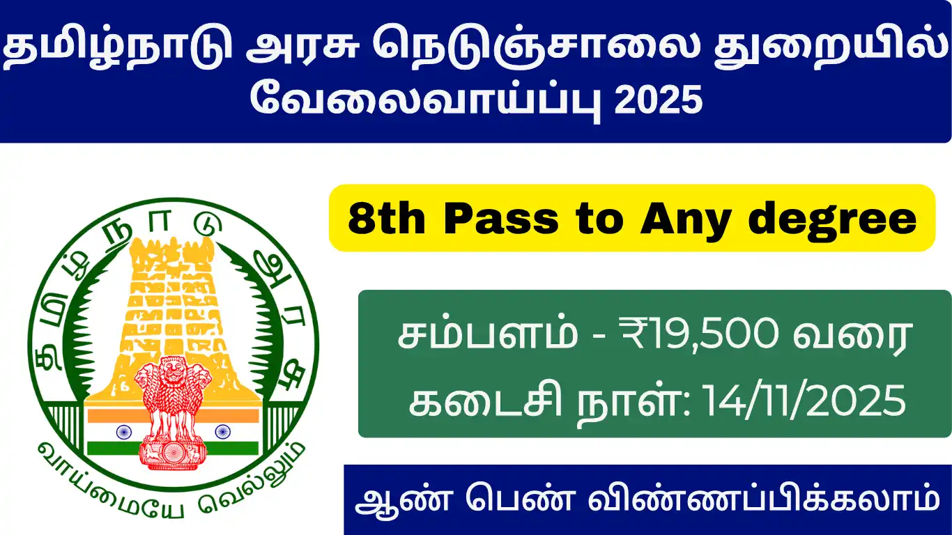 TN Govt Highways Dept Job Recruitment 2025 releases the official notification from the starting date of 04/10/2025 and the closing date of 14/11/2025 . For the applying TN Govt Highways Dept Job Recruitment 2025 – Various, Office Assistant, Driver Post procedure, the candidate needs to fill out their respective application either online or offline as per the notification released by TN Govt Highways Dept . Below we have explained briefly explained about the TN Govt Highways Dept Job Recruitment 2025 – Various, Office Assistant, Driver Post like education details, age limits, how to apply, closing date of TN Govt Highways Dept Job Recruitment 2025 .