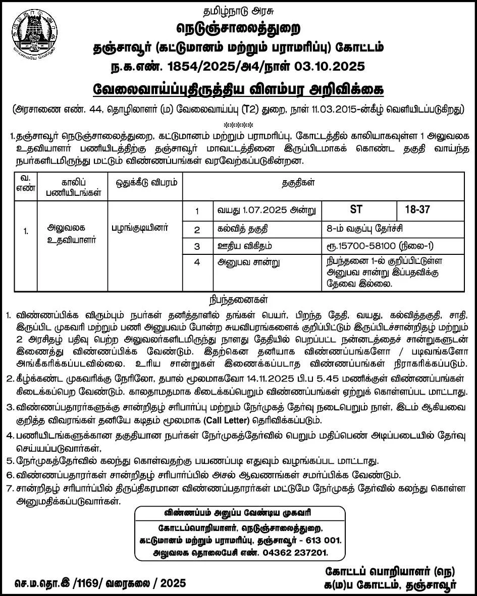 TN Govt Highways Dept Job Recruitment 2025 official notification available on (04/10/2025 )