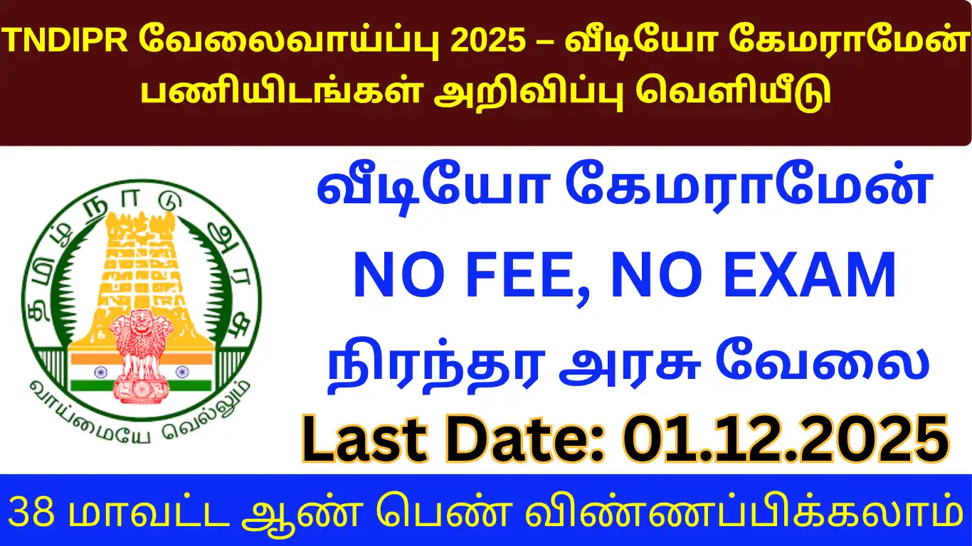 TNDIPR Job Recruitment 2025 releases the official notification from the starting date of 18/11/2025 and the closing date of 01/12/2025 . For the applying TNDIPR Job Recruitment 2025 – Various, Video Cameraman Post procedure, the candidate needs to fill out their respective application either online or offline as per the notification released by TNDIPR Chennai . Below we have explained briefly explained about the TNDIPR Job Recruitment 2025 – Various, Video Cameraman Post like education details, age limits, how to apply, closing date of TNDIPR Job Recruitment 2025 .