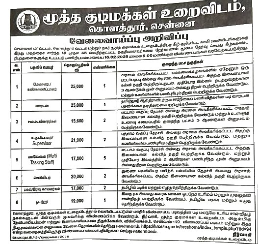 TNHRCE Senior Citizens Home Job Recruitment 2026 releases the official notification from the starting date of 01/02/2026 and the closing date of 16/02/2026 . For the applying TNHRCE Senior Citizens Home Job Recruitment 2026 – Various, Office Assistant & Driver Post procedure, the candidate needs to fill out their respective application either online or offline as per the notification released by TNHRCE Senior Citizens Home . Below we have explained briefly explained about the TNHRCE Senior Citizens Home Job Recruitment 2026 – Various, Office Assistant & Driver Post like education details, age limits, how to apply, closing date of TNHRCE Senior Citizens Home Job Recruitment 2026 .