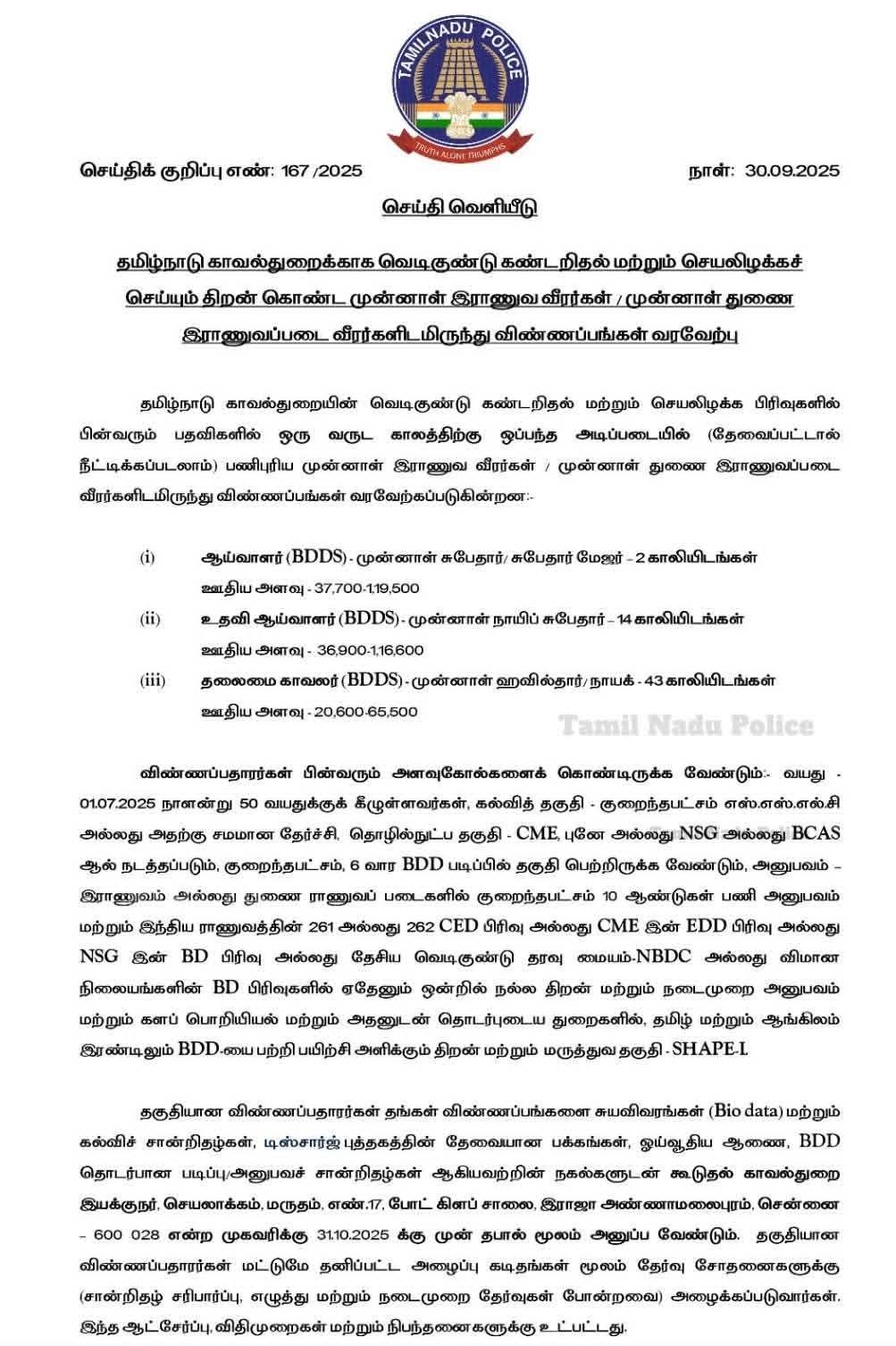 TNUSRB Job Recruitment 2025 official notification available on (30/09/2025 )