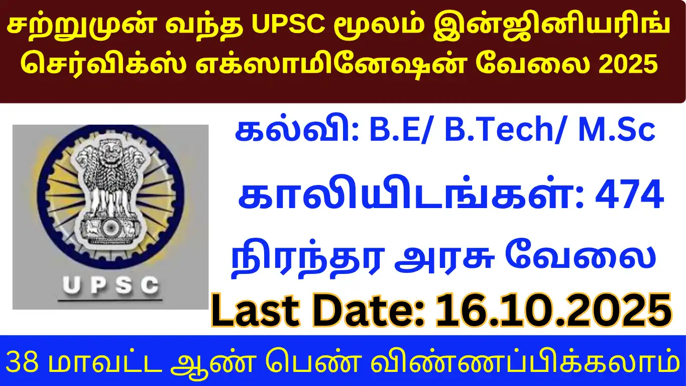 UPSC Job Recruitment 2025 releases the official notification from the starting date of 26/09/2025 and the closing date of 16/10/2025 . For the applying UPSC Job Recruitment 2025 – 474, Engineering Services Examination Post procedure, the candidate needs to fill out their respective application either online or offline as per the notification released by UPSC . Below we have explained briefly explained about the UPSC Job Recruitment 2025 – 474, Engineering Services Examination Post like education details, age limits, how to apply, closing date of UPSC Job Recruitment 2025 .